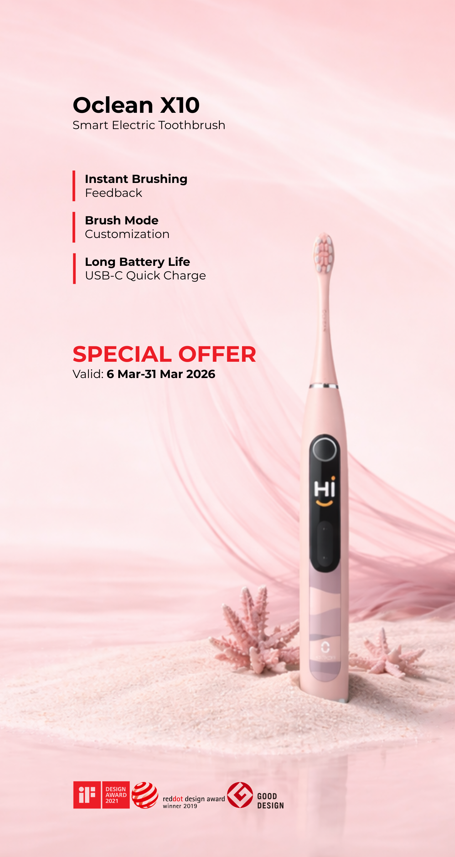 "O ecrã inteligente inovador apresenta pontuações de limpeza em tempo real, transformando a escovagem num hábito de precisão."